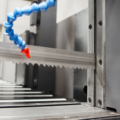 Automatyczna piła taśmowa o konstrukcji dwukolumnowej, zaprojektowana do prostopadłego cięcia zarówno materiałów pełnych, jak i profilowanych przy maksymalnej wydajności.