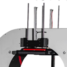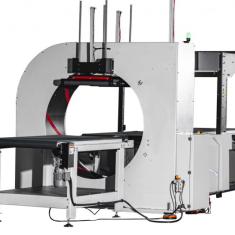 W pełni zautomatyzowana orbitalna maszyna do owijania folią stretch obejmująca elektrycznie sterowane przenośniki, sterownik PLC i 7-calowy panel dotykowy, automatyczny zespół mocowania i cięcia, automatyczne rolki stabilizujące i mostek do krótkich części