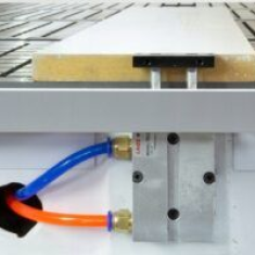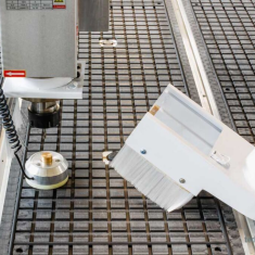 - Rama maszyny wykonana jest z grubościennych profili stalowych, poddanych procesowi odprężania termicznego w celu usunięcia naprężeń wewnętrznych powstałych podczas spawania. Dzięki temu konstrukcja zachowuje wysoką stabilność wymiarową nawet podczas długotrwałej pracy pod obciążeniem. Po procesie odprężania rama poddawana jest precyzyjnemu frezowaniu. Taka technologia wykonania gwarantuje doskonałą sztywność konstrukcji oraz precyzję geometryczną całego układu. Maszyna wyposażona jest w hybrydowy stół roboczy, łączący technologię podciśnieniową z szynami mechanicznymi, co umożliwia zarówno szybkie i wygodne mocowanie płaskich materiałów przy użyciu podciśnienia, jak i stabilne mocowanie detali o nieregularnych kształtach lub większym ciężarze za pomocą mechanicznych punktów bazowych. To uniwersalne rozwiązanie znacząco zwiększa elastyczność pracy maszyny w różnych zastosowaniach produkcyjnych.