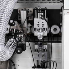 Zwoje do 3 mm grubości i paski do 4 mm, ta niedroga maszyna jest wyposażona w zbiornik kleju o pojemności 1,2 kg, wstępne frezowanie, automatyczne klejenie, cięcie krawędzi, przycinanie końców, frezowanie góra-dół, cyklinę promieniową i cyklinę klejową.