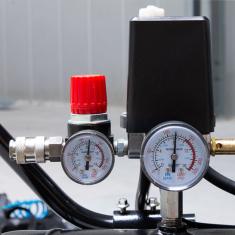 - Łatwe sterowanie – wyłącznik ciśnieniowy Start/Stop, regulator ciśnienia i szybkozłącze zapewniają pełną kontrolę nad pracą urządzenia.