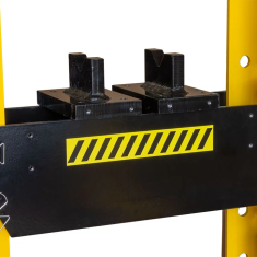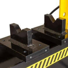 Dla wygody i bezpieczeństwa użytkowania wszystkie prasy wyposażono w manometr glicerynowy, który precyzyjnie wskazuje ciśnienie robocze oraz dwie pryzmy V z blokadą przesuwu, umożliwiające stabilne podparcie detali. W modelach o większej sile nacisku (50, 75 i 100 ton) dodatkowo zastosowano mechanizm korbowy podnoszenia stołu, ułatwiający jego regulację.