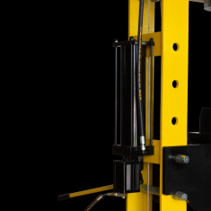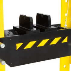 Dla wygody i bezpieczeństwa użytkowania wszystkie prasy wyposażono w manometr glicerynowy, który precyzyjnie wskazuje ciśnienie robocze oraz dwie pryzmy V z blokadą przesuwu, umożliwiające stabilne podparcie detali. W modelach o większej sile nacisku (50, 75 i 100 ton) dodatkowo zastosowano mechanizm korbowy podnoszenia stołu, ułatwiający jego regulację.