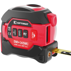 Miara zwijana z laserem 2w1 OPTIMAT to nowoczesna miarka laserowa z wbudowanym dalmierzem cyfrowym, łącząca klasyczną taśmę mierniczą (długość 5m) z precyzyjnym laserem o zasięgu do 45 metrów. Stworzona do szybkiego i dokładnego pomiaru długości, powierzchni oraz objętości. Urządzenie łączy w sobie klasyczną taśmę mierniczą o długości 5 m (tolerancja ±1,3 mm, szerokość 19 mm) z laserem o zasięgu do 45 m, tworząc kompaktowe i niezwykle praktyczne narzędzie 2w1.