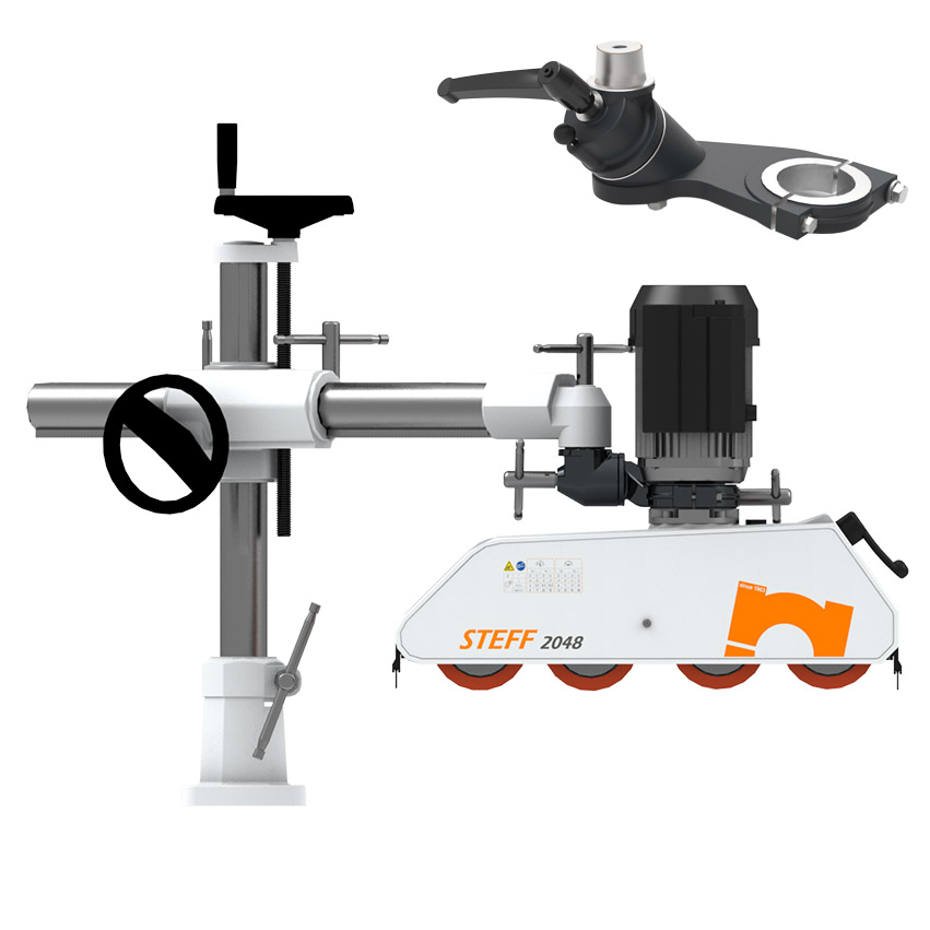 - Statyw uniwersalny (opcja dodatkowa) - do łatwego ustawiania i regulacji zespołu podającego na obrabiarce. Jest łatwy do zamocowania, stabilny i mocny: stopa, element krzyżowy, rura, przegub i kołnierz wykonane są z żeliwa, a dwie kolumny z rektyfikowanej stali o znacznej grubości. Uchwyty wykonane ze stali i kółka regulacyjne umożliwiają szybkie i dokładne ustawienie.