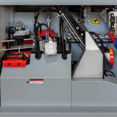 - jednostronna automatyczna okleiniarka z agregatem do wstępnego frezowania (podwójny frez obracająca się w lewo/prawo), wyposażona w frez o średnicy ø80 mm; silnik o mocy 1,1 kW na jednostkę i prędkość frezu 12 000 obr/min