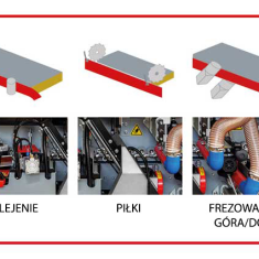 - agregat piły poprzecznej do cięcia obrzeża (jedna jednostka dla przedniej i tylnej strony) silnik o mocy 0,37 kW i prędkości 12 000 obr/min (prędkość tarczy piły)