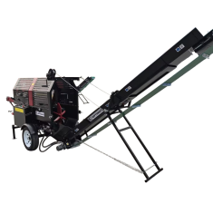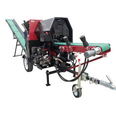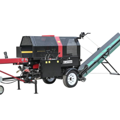 Spalinowa piła‑łuparka 20 ton z hydraulicznym podawaniem, dociskiem i regulacją kąta wyrzutnika – mobilna, wydajna i niezależna w pracy. Idealna do cięcia i rozłupywania dużych kłód drewna w terenie, warsztacie i gospodarstwie.